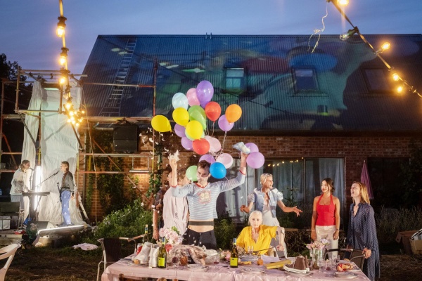 In de tuin van het ouderlijk huis komen vier generaties uit één familie samen.